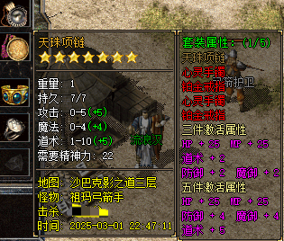 1、套装属性,沃玛,祖玛,赤月,魔龙,战神等不同级别装备均有套装属性(3件激活、5件激活),让低级装备也能以下克上。